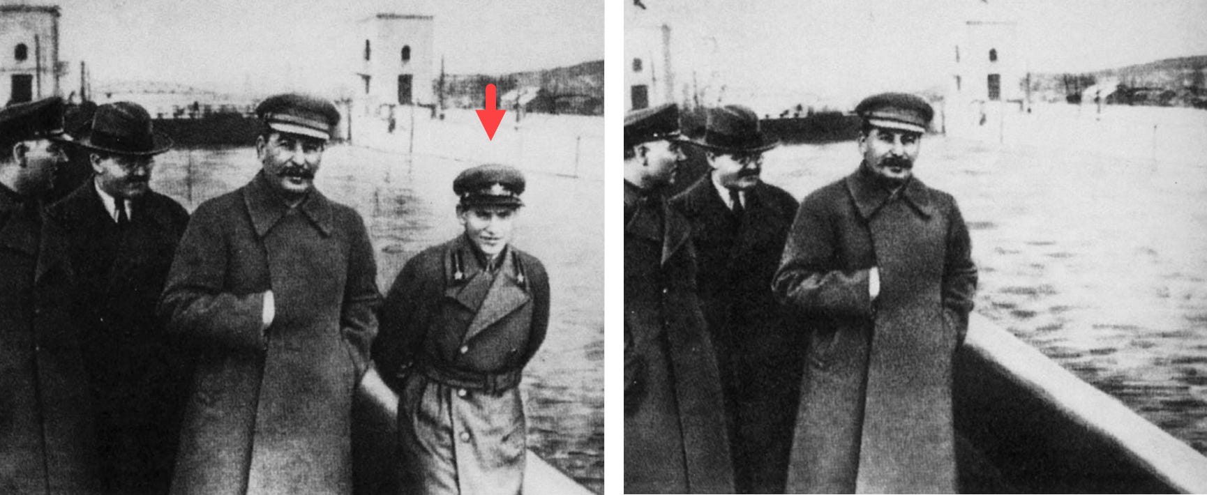 The Union of Soviet Socialist Republics was well known for photographic manipulation during the Stalinist regime. When people fell out of favor with Stalin, were accused of being traitors and executed; then they disappeared from photographs.